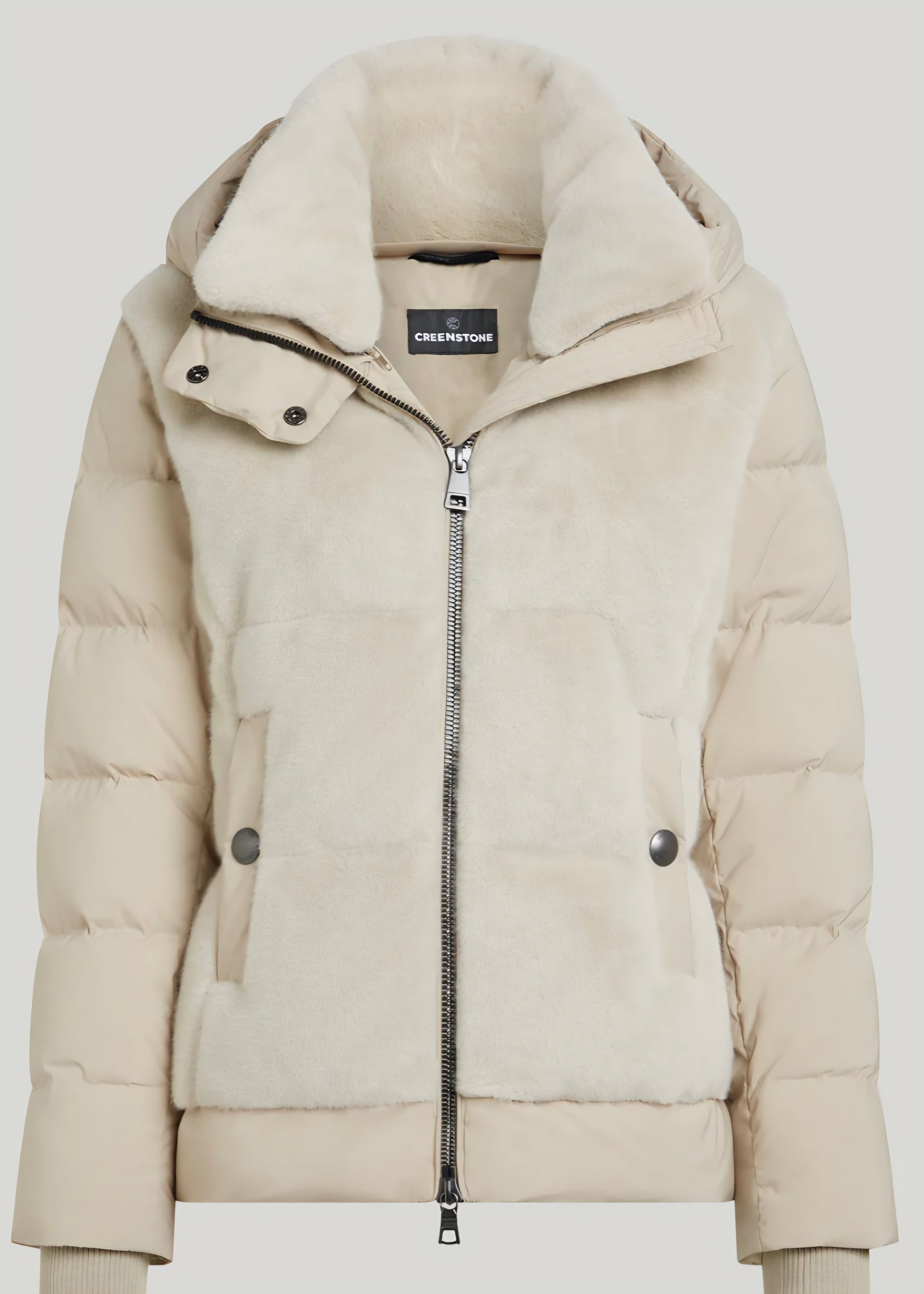 Teddy bonded with suedine at sleeves, collar, hem and shoulder panel